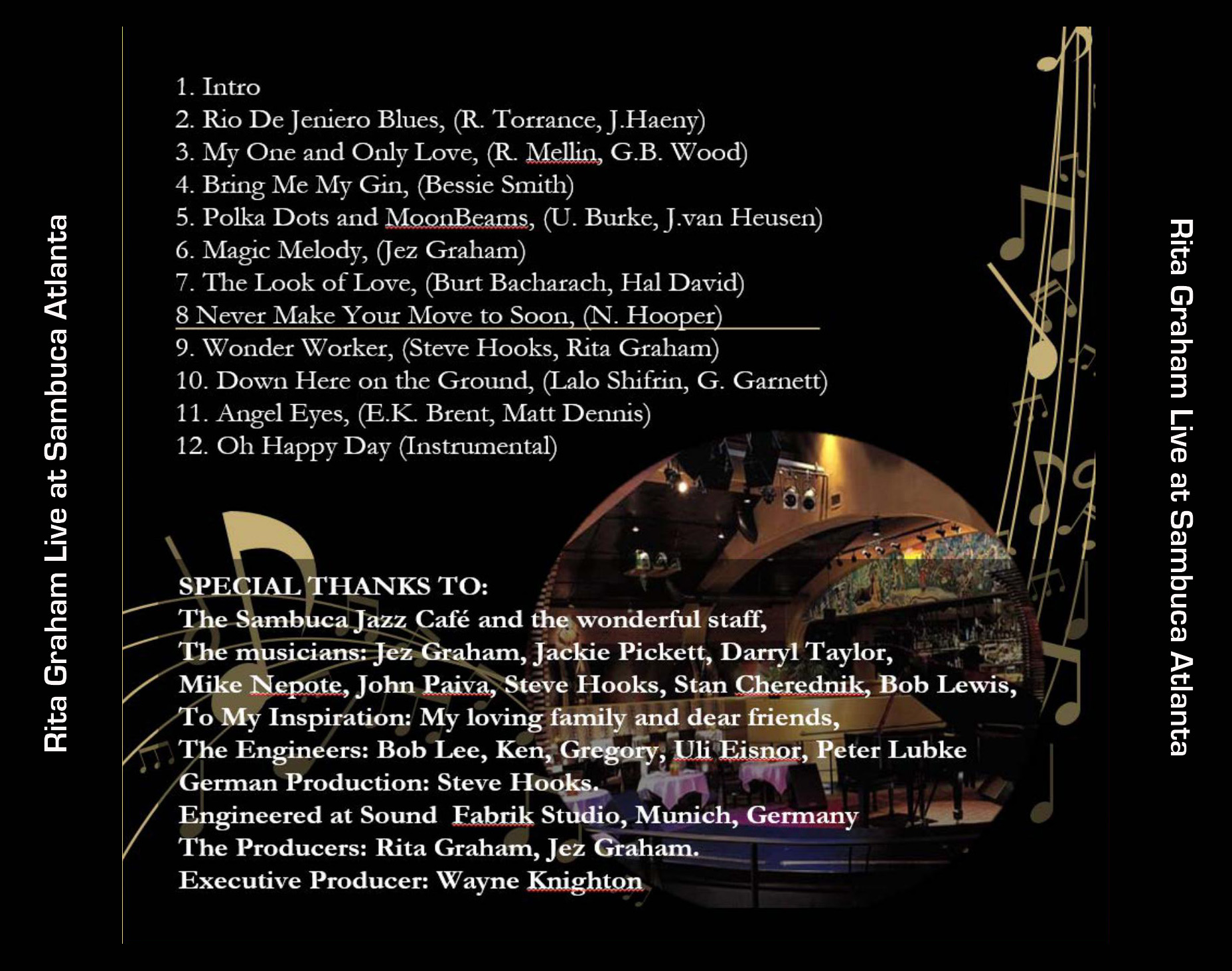 The CD Rita Graham Live at Sambuca Atlanta captures an exciting evening at Atlanta’s legendary supper club, Sambuca Jazz Cafe. Rita Graham’s Sunday Night Band presented a lush collection of Jazz, Blues and Soul there from 1999- 2009. Featured are pianist Jez Graham, the late German saxophonist Steve Hooks and former Four Seasons’ guitarist, John Paiva.